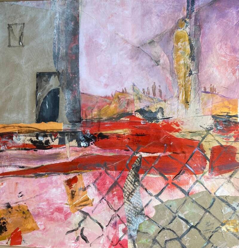 "anti-hero" 80 x 80 gemengde techniek €350,- " wat bleef" 80 x 80 gemengde techniek €350,-